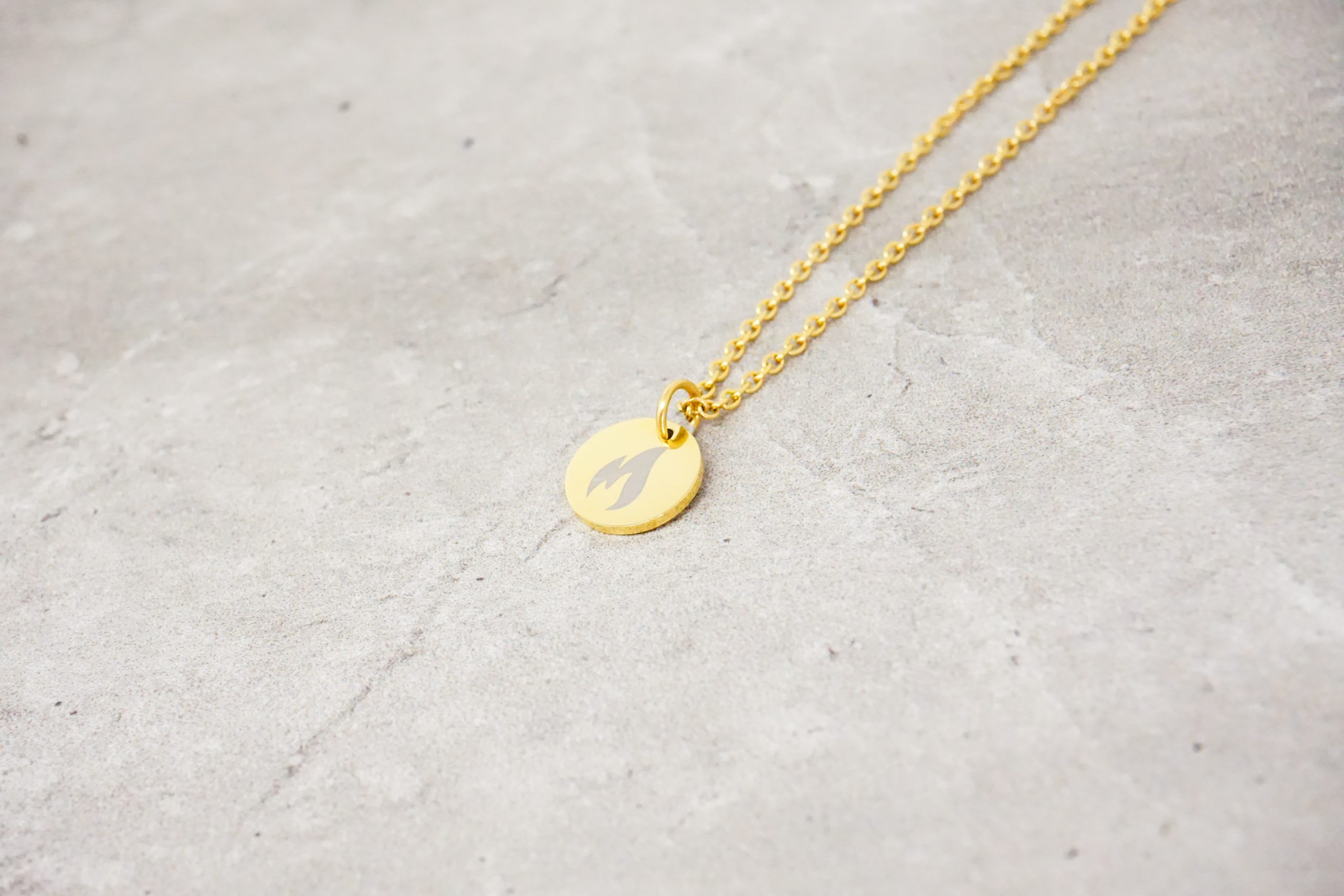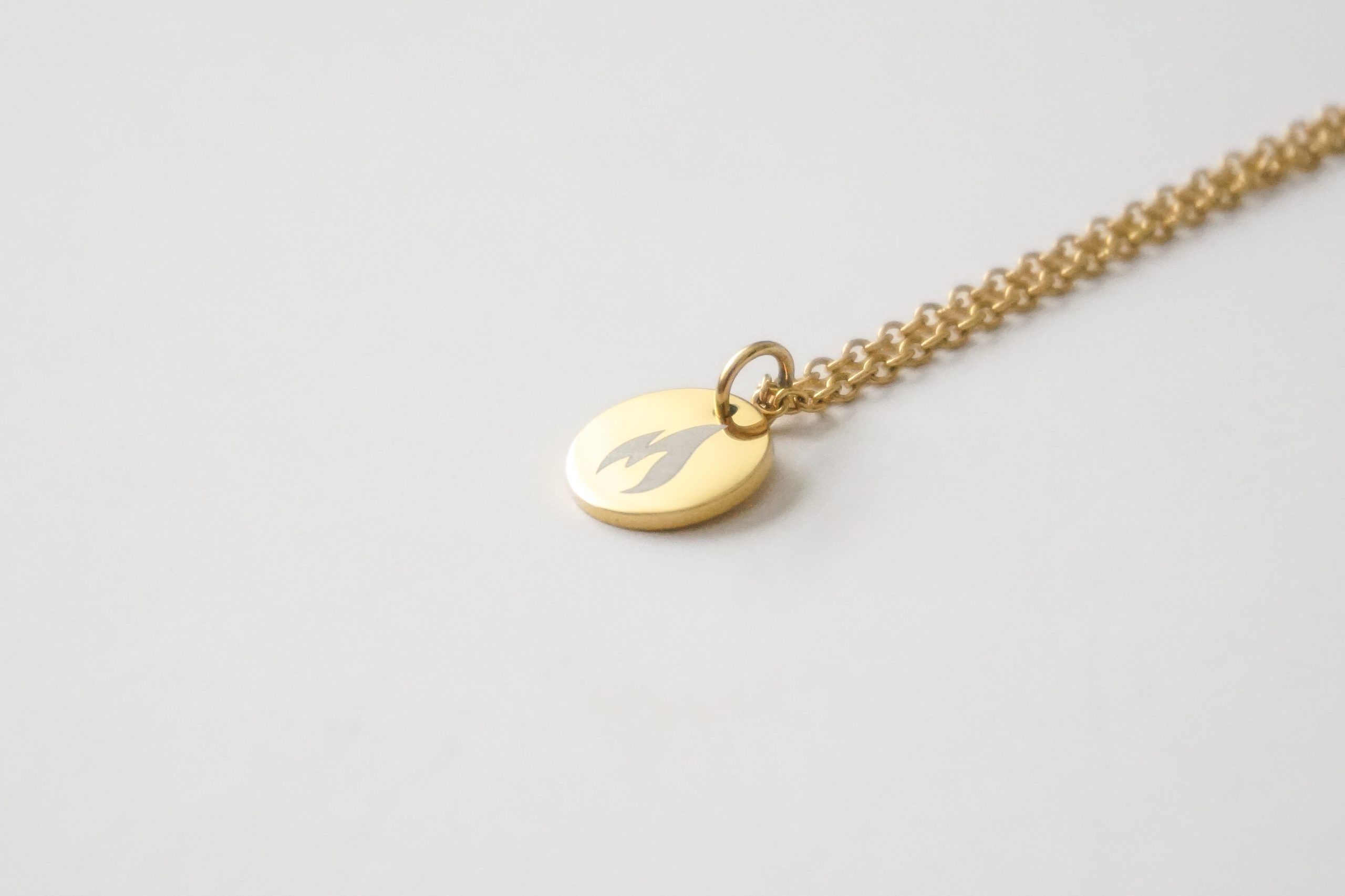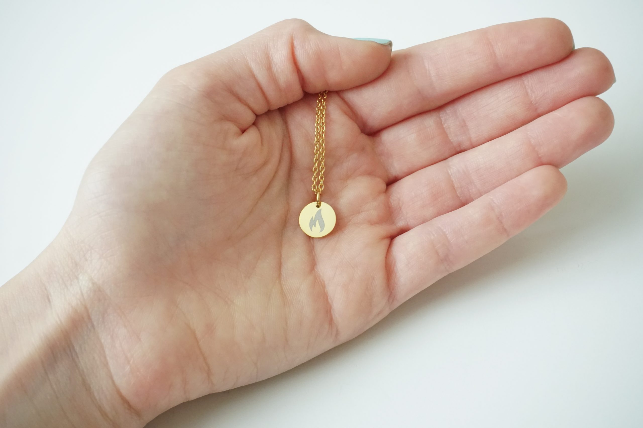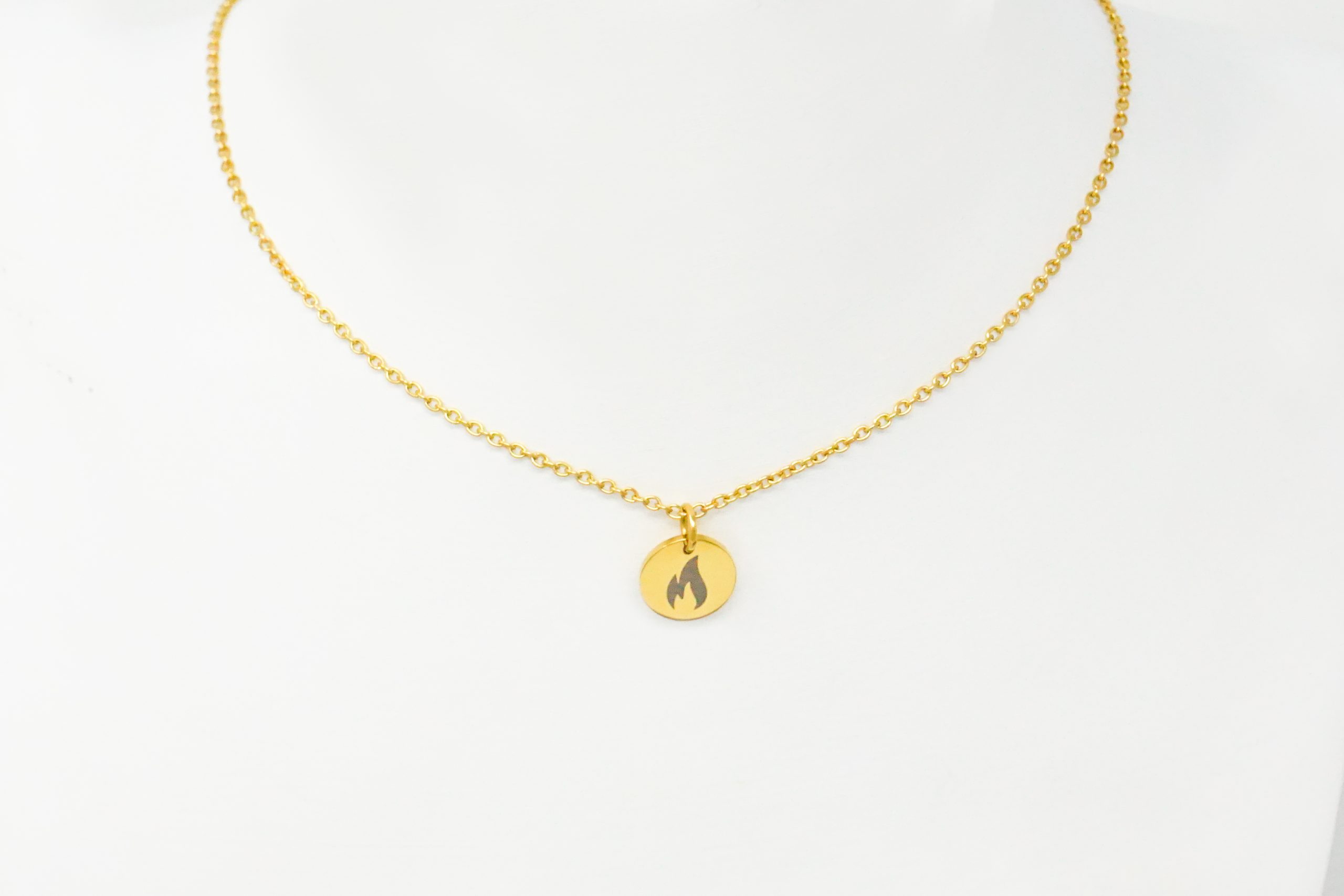 This disc necklace with a fire symbol is gold or silver plated stainless steel.